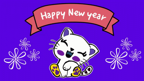 Digital Pratik and Jorrparivar wish a Happy New Year with a cute animated white cat and flowers.