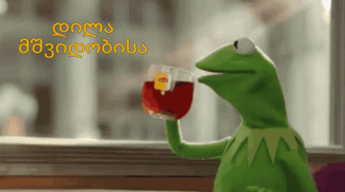 Kermit The Frog sips Lipton tea by the window, wishing a good morning.