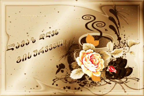 A beautiful Georgian 'Good Morning' greeting card featuring a steaming cup of coffee and elegant flowers.
