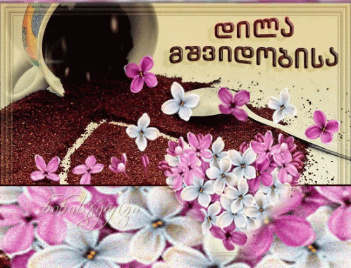 A beautiful Georgian good morning greeting card with coffee, flowers, and a heart design.
