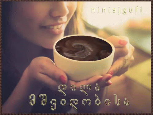 Woman holding a warm cup of coffee, with 'ninisjgufi' and 'Good morning Coffee' text on the image.