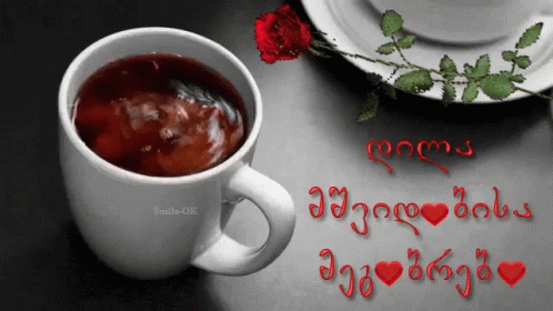 A warm good morning message to Ninisjgroup with a cup of tea and a red rose.