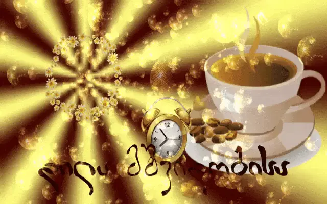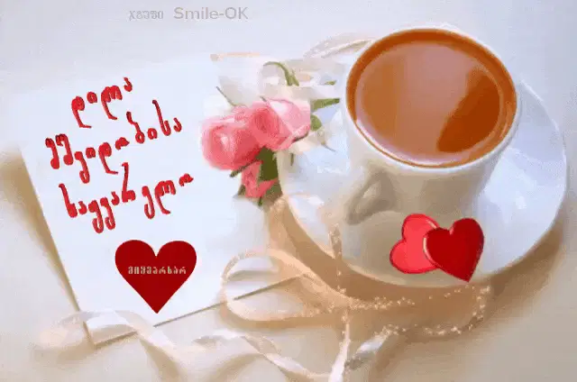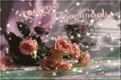 A beautiful Good Morning greeting card featuring pink roses, a teacup, and sparkling effects for Ninijgupi.