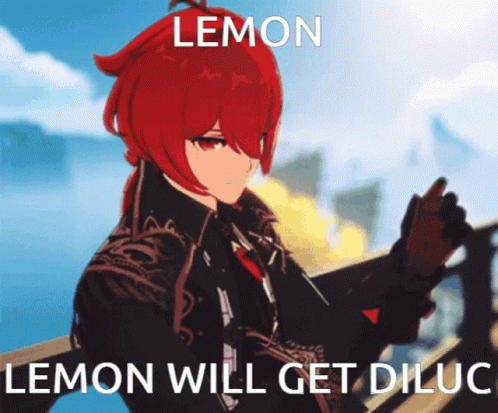 Diluc from Genshin Impact featured in a meme with the text 'Lemon will get Diluc'.
