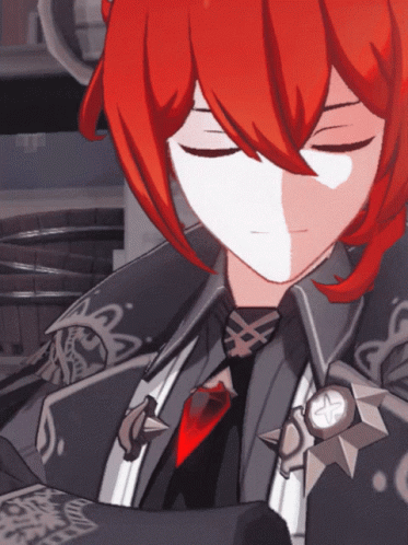 Diluc, the red-haired anime character from Genshin Impact, shown with a 'Hmph' expression.