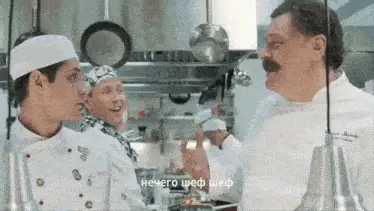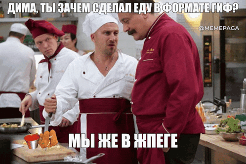 A Russian meme featuring chefs in a kitchen, questioning why food was made in GIF format when they are in JPEG.
