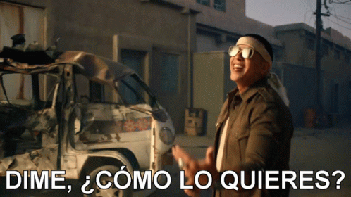 Daddy Yankee asks 'Dime, ¿cómo lo quieres?' in an urban setting, gesturing with open hands.