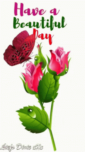 A beautiful butterfly rests on pink roses with the message 'Have a Beautiful Day' from Dinie.