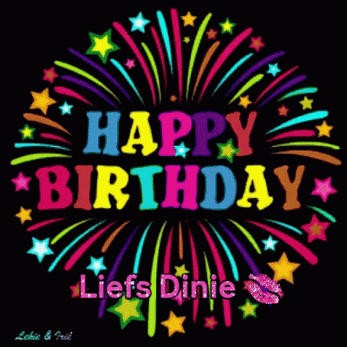 Happy Birthday greeting for Dinie with colorful text, stars, and a kiss mark, signed by Lekie & Tril.