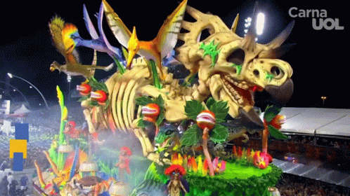Spectacular dinosaur-themed float at Carna UOL Carnaval parade, featuring a triceratops skull and pterodactyls.