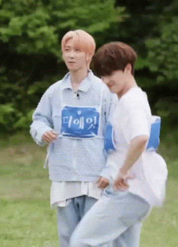 Seventeen member Dino (Lee Chan) shows off his dance moves outdoors, wearing a blue vest and making a peace sign.