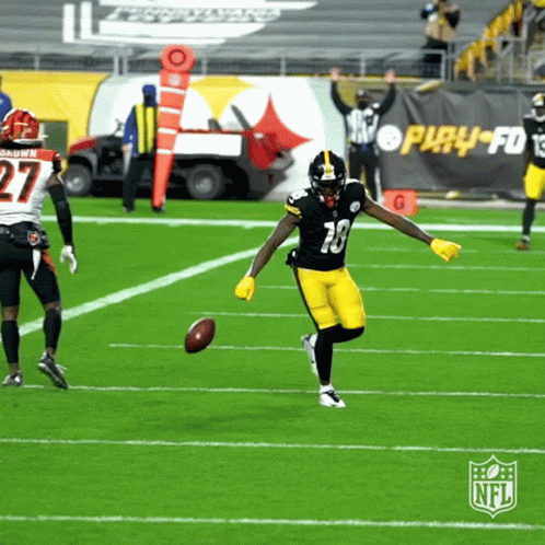 Diontae Johnson of the Steelers kicks a football and celebrates on the field during a game.
