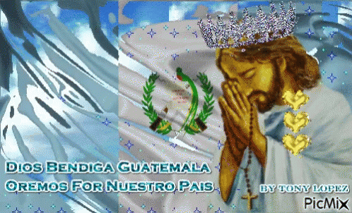 Jesus Christ praying with the flag of Guatemala in the background, with text 'Dios Bendiga Guatemala'.