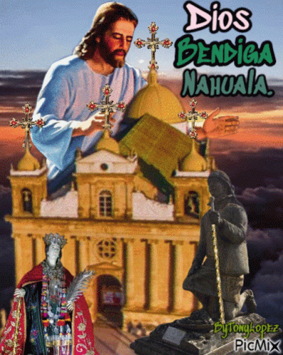Image featuring Jesus, a church, and statues, with the text 'Dios Bendiga Nahuala' (God Bless Nahuala).