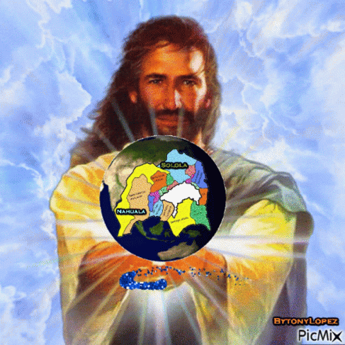 Jesus holding a globe featuring a map with regions like Solola and Nahuala, radiating light.