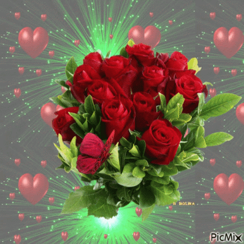 A beautiful bouquet of red roses with a butterfly, surrounded by glowing hearts and a 'God Bless You' message.
