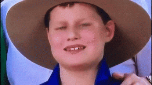 A young boy, possibly Diplein, wearing a cowboy hat and blue shirt, makes a peculiar face, sticking out his tongue.