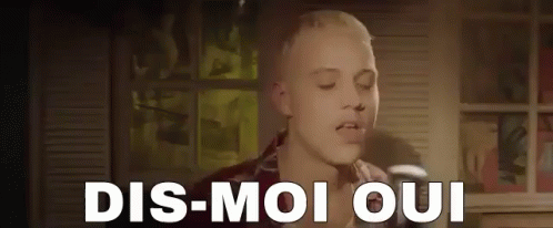 PLK sings 'Dis-moi Oui' into a vintage microphone, with the phrase displayed prominently on screen.