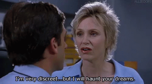 Jane Lynch as Paula tells Steve Carell as Andy Stitzer, "I'm very discreet...but I will haunt your dreams."