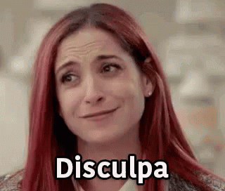 Red-haired woman makes a funny, apologetic face with the word 'Disculpa' (Sorry) displayed.