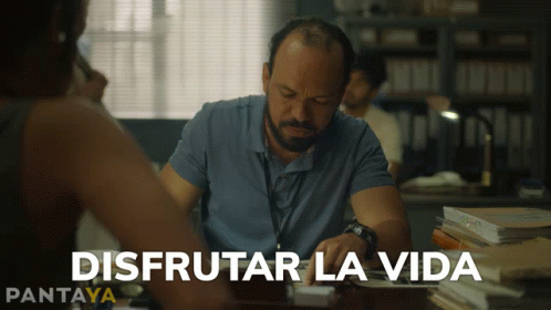 A man works at a desk with 'Enjoy Life' and 'Pantaya' visible, likely from the series Malayerba.