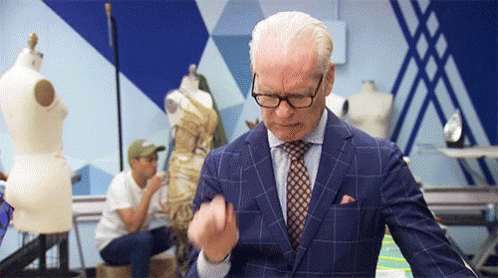 Tim Gunn shows a look of disgust while standing in a fashion workshop with mannequins in the background.