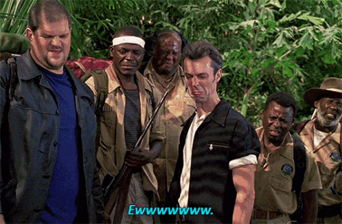 a group of men are standing in the woods and one of them is saying ewwwwww