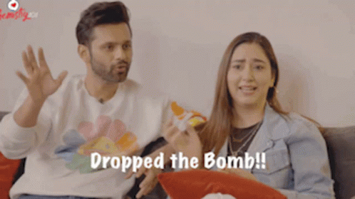 Dishul, Rahul Vaidya and Disha Parmar, react playfully on a couch with the text 'Dropped the Bomb!!' on screen.