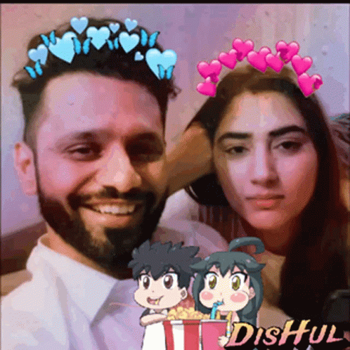 Rahul Vaidya and Disha Parmar (Dishul) pose with heart filters, featuring cute cartoon characters.