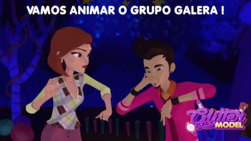 Animated man and woman dance to liven up the group in this advertisement for Glitter MODEL.