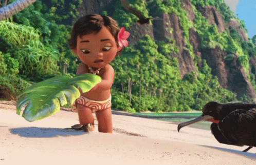Baby Moana on a tropical beach, holding a leaf and interacting with a bird.