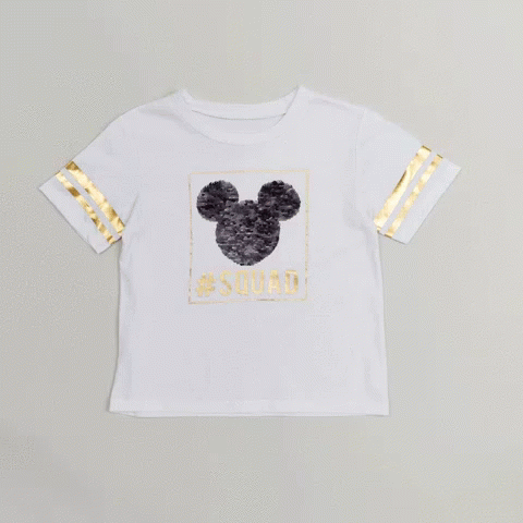 White Disney t-shirt featuring a sequined Mickey Mouse head that changes color, with '#SQUAD' text.