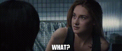 Tris Prior (Shailene Woodley) looks confused and asks "What?" while talking to a man in a dark room.