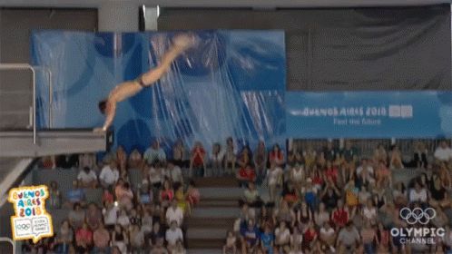An athlete performs a spectacular somersault dive from a high platform during the Youth Olympic Games in Buenos Aires.