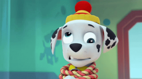 A cute, dizzy dalmatian puppy wearing a red and yellow clown hat and a rope around its neck.