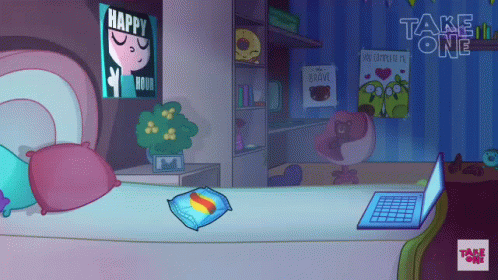 Two cartoon girls get dizzy with stars spinning around their heads in a colorful bedroom scene.