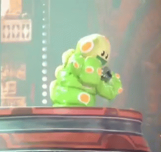 A green and yellow cartoon caterpillar character, resembling a DJ, holds a microphone and moves to music.