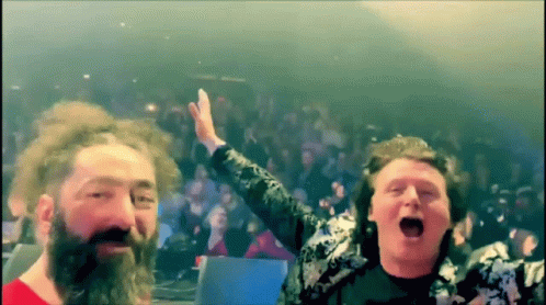 Dj Fou and Boris share a happy moment on stage at a lively disco soirée, engaging with the crowd.