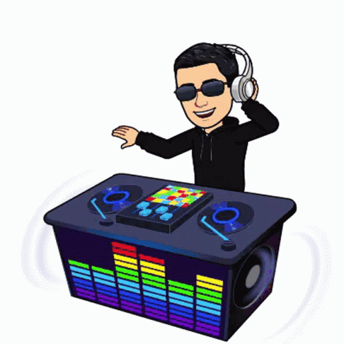 Cartoon DJ with headphones and sunglasses mixing music on a turntable.
