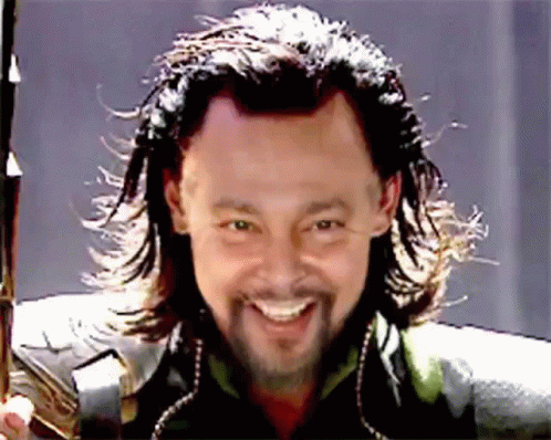 Dj Noelthezone smiles mischievously, wearing a costume and holding a prop. His long hair and beard frame his happy face.