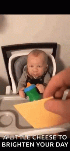 An adult places a slice of American cheese on a baby's face, eliciting a surprised reaction.