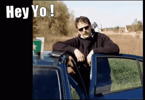 Djpknox leaning on a blue car, wearing sunglasses and headphones, with the text 'Hey Yo!' displayed.
