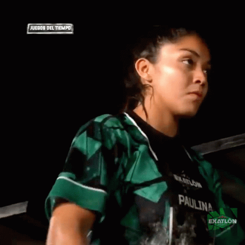Paulina from Exatlón México, wearing a green and black shirt, touches her forehead in a moment of reflection or prayer.