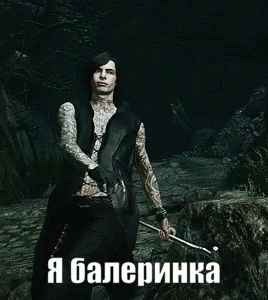 V from Dmc Devil May Cry strikes a pose with his cane, declaring 'I am a ballerina' in a dark setting.