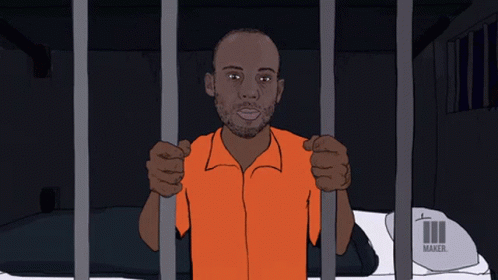 Animated DMX Bear behind bars in jail, looking out from his cell while being offered a chocolate bar.