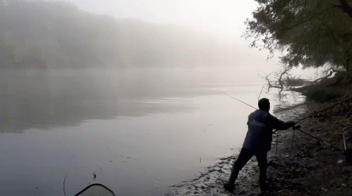 A man casts his fishing line into the misty Dniester River during an early morning fishing trip.