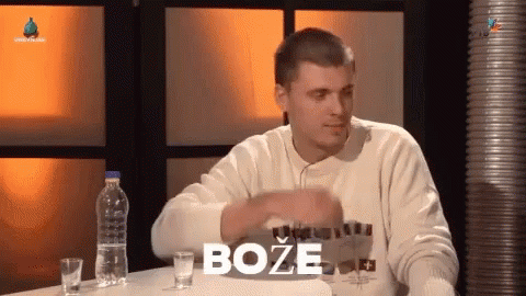 A man from the show Dnevnjak reacts with 'Bože Sačuvaj' (God forbid) while sitting at a table with drinks.