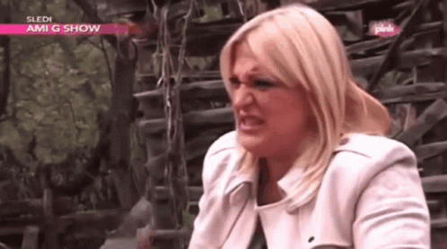 Nataša DNK makes a disgusted or funny face while sitting in a white jacket, likely on the Ami G Show.
