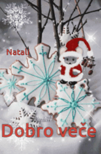 A festive winter scene with snowflake cookies and a Santa figure, featuring the greeting 'Natali Good evening'.