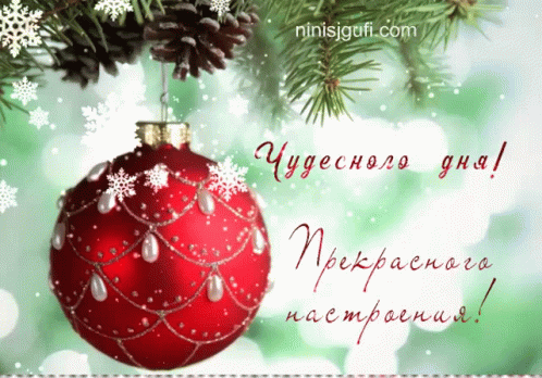 A festive Christmas card featuring a red ornament, snowflakes, and Russian holiday greetings.